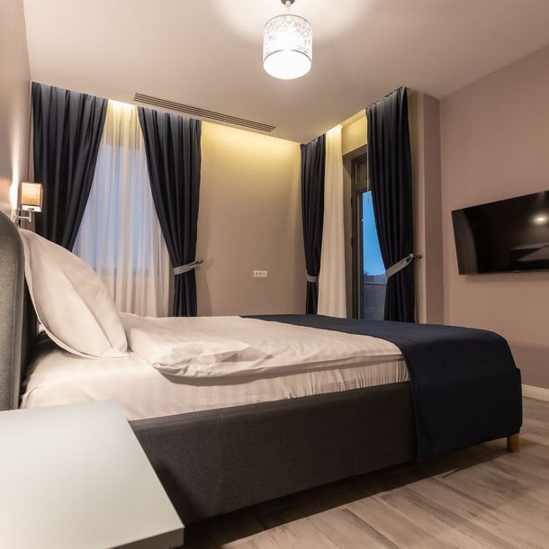 Apartamentul superior dispune de un living extra spatios, o zona de dining si un birou, ceea ce il face o alegere excelenta pentru cei care se afla in calatorii de afaceri.