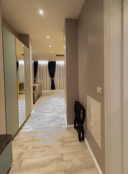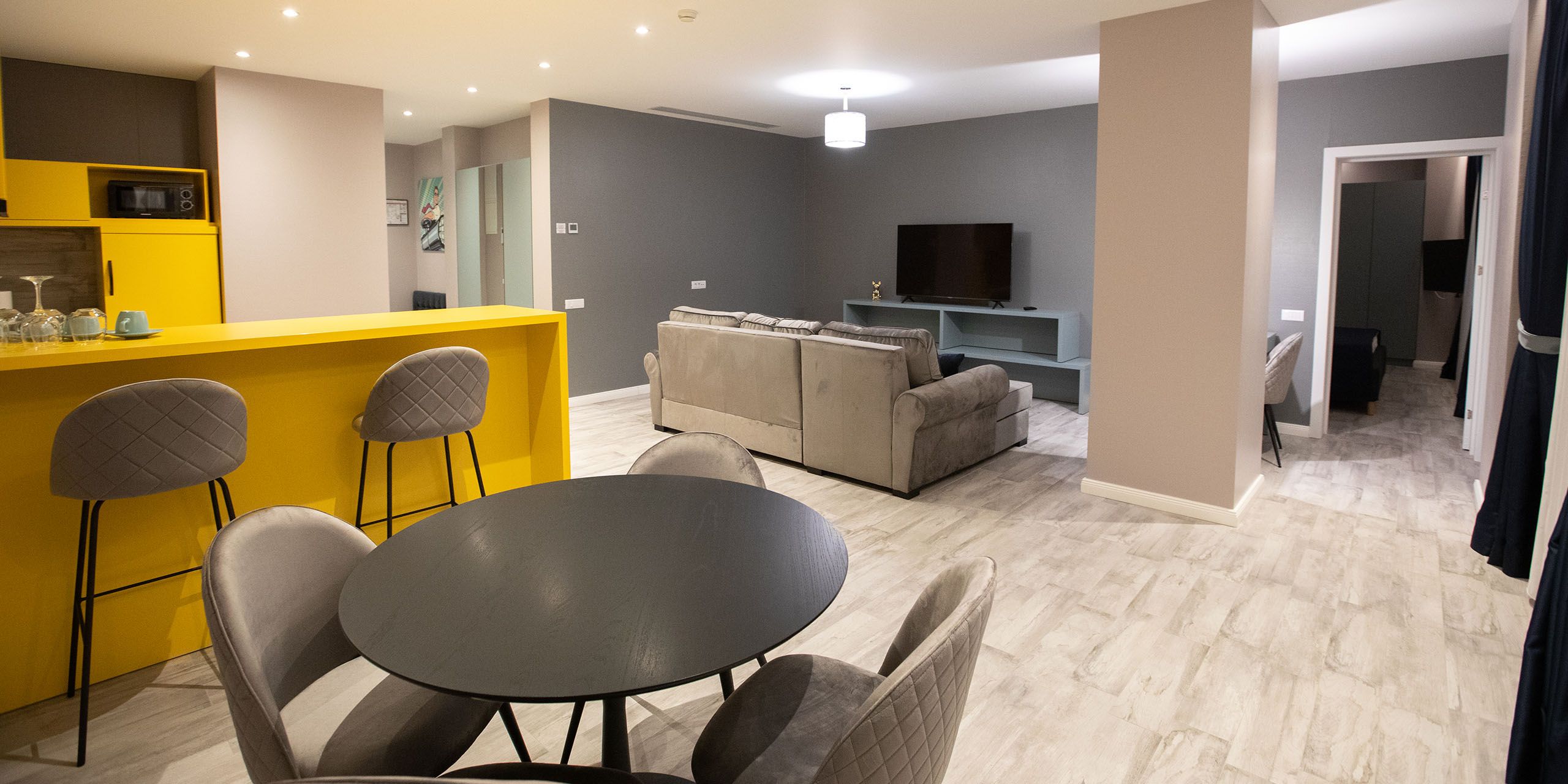 Apartamentul este o unitate frumos proiectata, care are o zona de living foarte spatioasa, ideala pentru oaspeti, cu o zona de dinning si bucatarie mare open space. Bucataria este complet utilata, ceea ce o face locul perfect pentru a gati si a distra oaspetii.